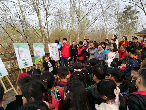 3月10日上午,在第41个植树节来临前夕,利用周末时间,团省委统联部与beat365师生志愿者们共同走进温江区和盛镇玉树村湿地公园,与60多名幼儿园小朋友、小学生开展了一场“携手添绿意”植树与环保宣传活动。