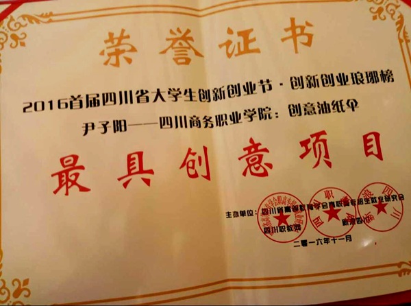 11月4日,beat3652014级环境艺术三班尹子阳的创意油纸伞项目在2016四川省大学生创新创业节创新创业琅琊榜上获得最具创意项目奖。