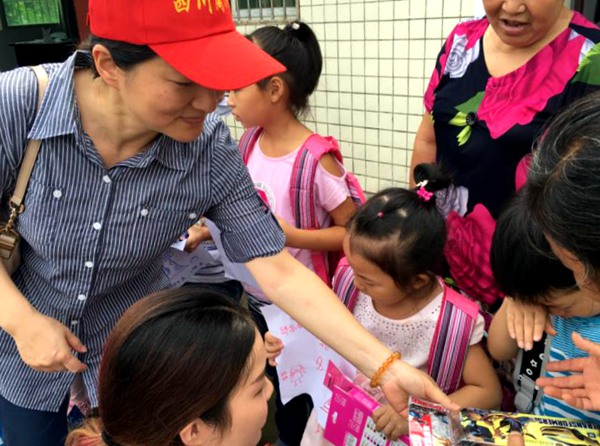 为小朋友分发书包、文具文具