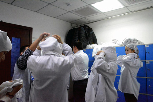 接着,师生们来到位于蛟龙工业港的全家鲜食制作中心。按照企业规范要求,同学们穿上企业精心准备的服装鞋帽,经过全身除尘、除静电、消毒的严格程序后,有序地进入鲜食制作中心进行参观,体验了一把鲜食制作全过程。同学们真切地感受了全家对食品安全和质量的规范要求,对企业的精细化管理深有感触。从鲜食中心出来以后,同学们围着商品课长杨亚霖开始了狂轰滥炸式的提问,杨课长耐心地逐一解答大家的疑问。