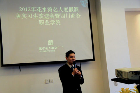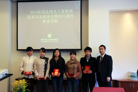 2012年2月22日下午3点在南京厅举行花水湾名人度假酒店为beat365英国官网网站假期勤工俭学同学们举办了欢送会,出席会议的有酒店总经理,人力资源部总监,餐饮部、管家部、四季温泉谷和前厅部负责人。