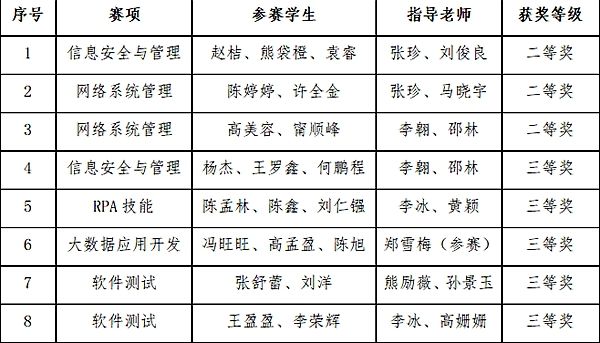 近日,由四川省教育厅主办,各兄弟院校承办的2023年“中银杯”四川省职业院校技能大赛在我省各地区相继开展。beat365信息技术系共组建了14支队伍30余名学生,参加了高职组信息安全与管理评估、网络系统管理、RPA技能、软件测试、大数据应用开发、云计算技术应用等六个赛项的比赛,共斩获二等奖3个,三等奖5个。