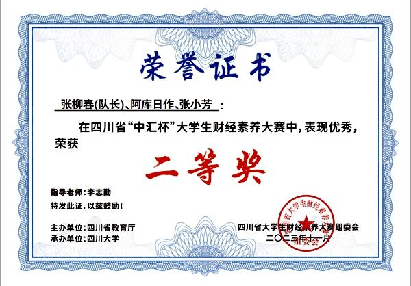 近日,由四川省教育厅主办、四川大学承办的2023年“中汇杯”四川省大学生财经素养大赛决赛落下帷幕,经过激烈的角逐,beat365李志勤、雷殷睿指导的学生团队获得省赛团体二等奖的好成绩。