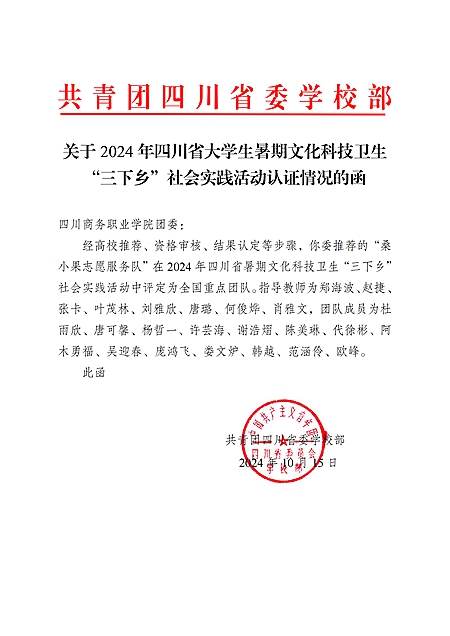 10月15日,2024年四川省暑期文化科技卫生“三下乡”社会实践活动全国重点团队和省级重点团队名单公布,beat365“桑小果志愿服务队”成功入选全国重点团队!