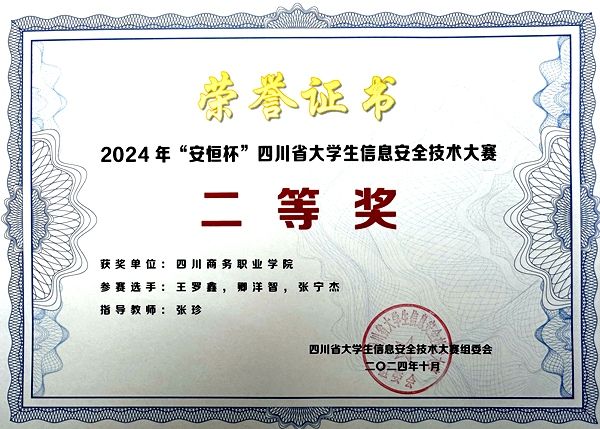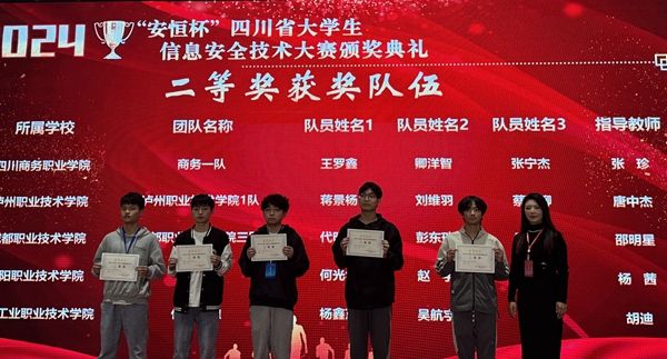 近日,由四川省教育厅主办,中共四川省委网信办和四川省公安厅协办的2024年“安恒杯”四川省大学生信息安全技术大赛在成都信息工程大学双流新型产业学院举行,beat365信息技术系张珍老师指导的商务一队斩获二等奖。