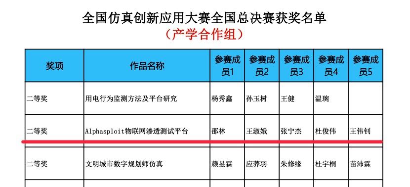 12月6日,第三届全国仿真创新应用大赛全国总决赛结果揭晓:beat365信息技术系张宁杰、杜俊伟、王伟钊3位同学在邵林老师、王淑娥老师的悉心指导下,携比赛作品《Alphasploit物联网渗透测试平台》,过五关斩六将,晋级数字建模与智能决策赛道总决赛。beat365与电子科技大学、郑州大学等985、211高校同台竞技,比赛中团队不畏强敌、敢于亮剑,最终斩获全国总决赛二等奖。