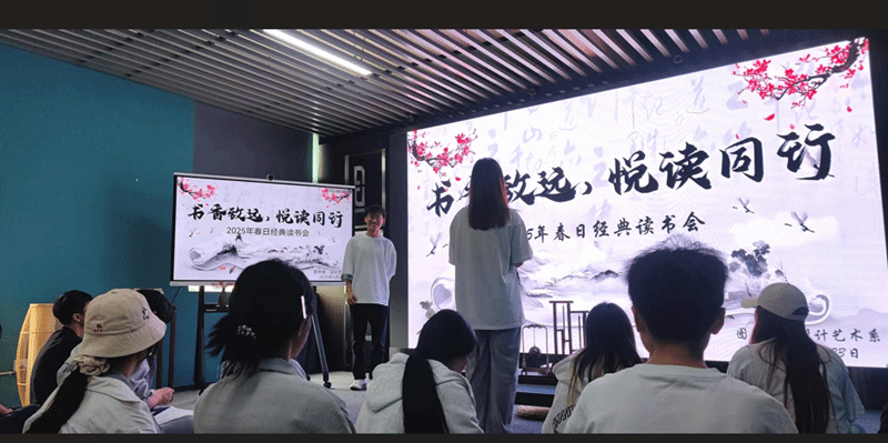 读书会以“飞花令”游戏拉开序幕。主持人以“春”“书”为关键词,邀请师生接龙并诵读相关诗词。“春风又绿江南岸”“书中自有黄金屋”等佳句频出,现场更有即兴场景演绎,诸如“谁家新燕啄春泥”之景栩栩如生,使古典诗词在互动中焕发新生,趣味盎然。