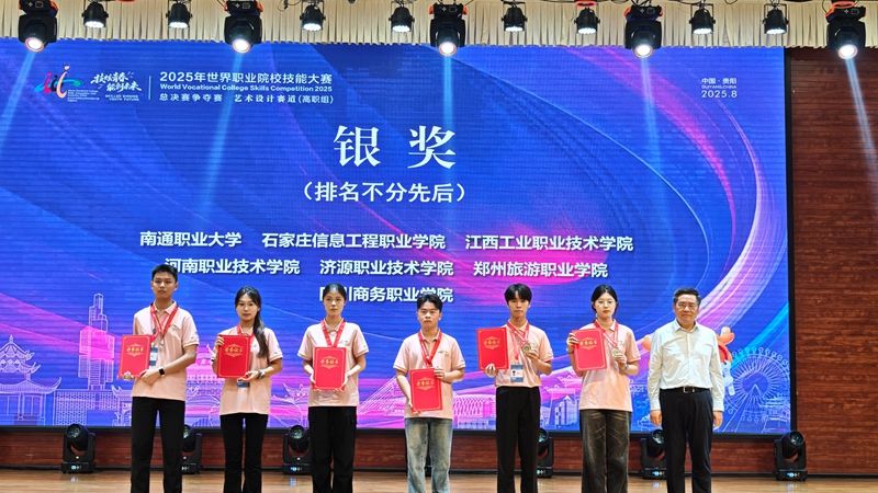 8月31日,2025年世界职业院校技能大赛总决赛艺术设计赛道在贵州电子商务职业技术学院落下帷幕。经过为期五天的激烈角逐,beat365英国官网网站设计艺术系代表队从全国近200支参赛队伍中脱颖而出,凭借扎实的专业功底、高效的团队协作与出色的创新设计能力,最终斩获银奖,为学院“双高计划”建设再添一份亮眼成绩。