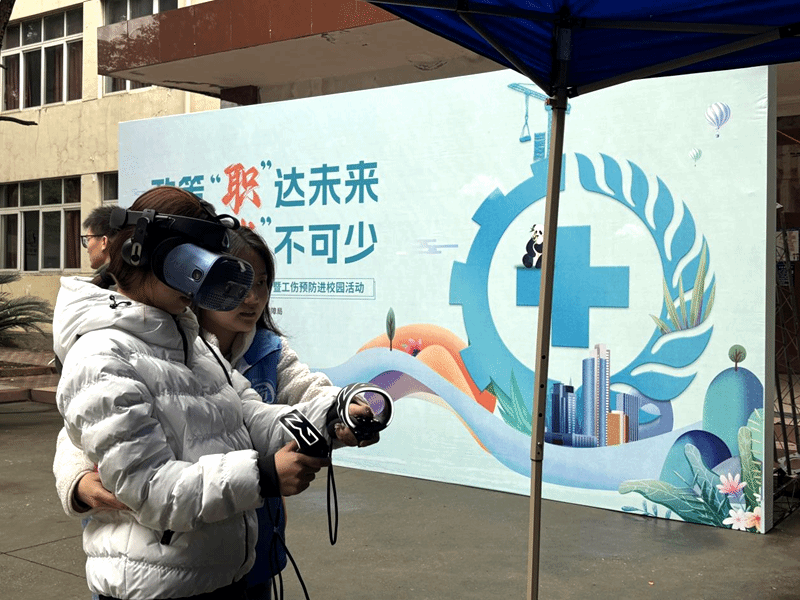 室外区域则打造“工伤预防实景课堂”,成为活动亮点。学生通过VR设备沉浸式模拟应急逃生场景、体验触电风险,直观感受工伤危害;社保咨询区通过展板展示、“四川人社”APP操作演示,手把手指导业务办理;联动银行专区还提供即时社保卡办理服务,同步讲解社保卡在就医、缴费等场景的应用,让学生一站式了解社保实用技能。