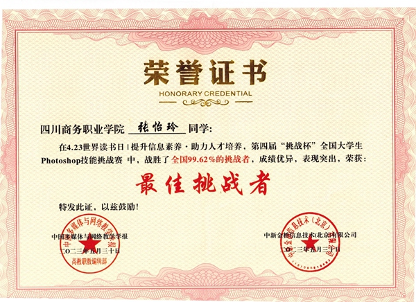 由教育部主管、清华大学主办的《中国多媒体与网络教学学报》同中新金桥信息技术(北京)有限公司联合举办的4.23 世界读书日“提升信息素养 助力人才培养”第四届软件通“挑战杯”全国大学生信息化素养技能大赛活动圆满结束。活动期间共有来自全国300多所院校的20000余名同学参与四个项目的激烈角逐。在本次活动Photoshop版块答题挑战中,beat3652022级经管系电子商务2班张怡玲以12.71秒夺得第七名,2021级信息技术系大数据4班张雨以13.51秒勇夺第九名,分别战胜了全国99.49%、99.62%的挑战者,成绩优异,表现突出,荣获“最佳挑战者”。beat365有98名同学报名参加四项大赛,人数创新高。