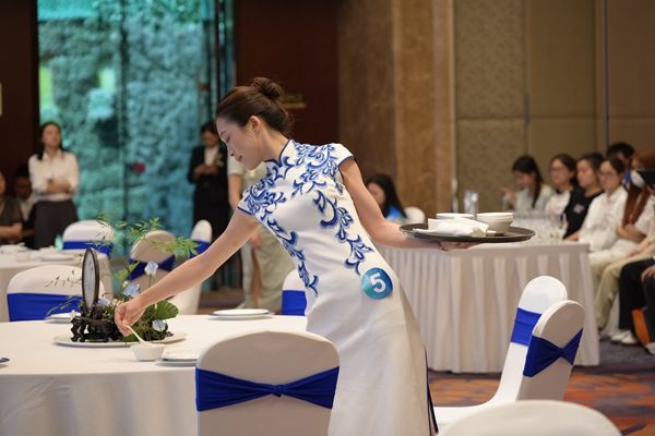王军、成都费尔顿大酒店人力资源总监彭杨洋分别为比赛致辞。两名行业专家和旅游管理系三名教师共同担任本次比赛评委,经过前期选拔的6名酒店管理与数字化运营专业同学参加比赛。比赛分为两轮,每轮三名同学同时进行主题宴会摆台。参赛选手身着旗袍,举止大方、面带微笑、姿势优雅。他们按照宴会摆台顺序,依次铺台布、主题造型、拉椅定位、用小毛巾擦手消毒、摆放餐酒用具、餐巾折花、摆放菜单、整理椅子。30分钟不到,一桌桌美轮美奂的主题宴会席面呈现在观众面前。五名评委仔细观察了选手摆台过程,并评价了席面展现效果。经过认真评选,比赛最终评出了一等奖1名、二等奖2名、三等奖3名。