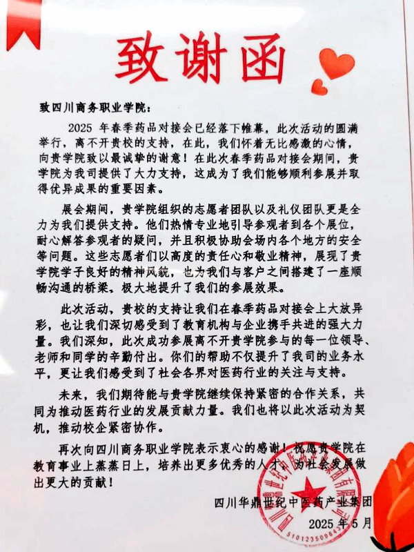 华鼎世纪集团副总裁简道兵在现场向学院颁发致谢函,对学院为本次药交会的成功举办所作的努力表示感谢,对beat365志愿者在药品交易会上的出色表现给予了高度肯定。企业方认为在为期两天的药交会上,志愿者们以饱满的热情、专业的素养投身服务工作,从展会现场的秩序维护、客商的接待引导,到联盟会前会议、产品推介会议上的会务服务,志愿者们在每一个细节都做到尽善尽美,极大提升了展会的服务品质与效率,助力了本届药交会的圆满举办。