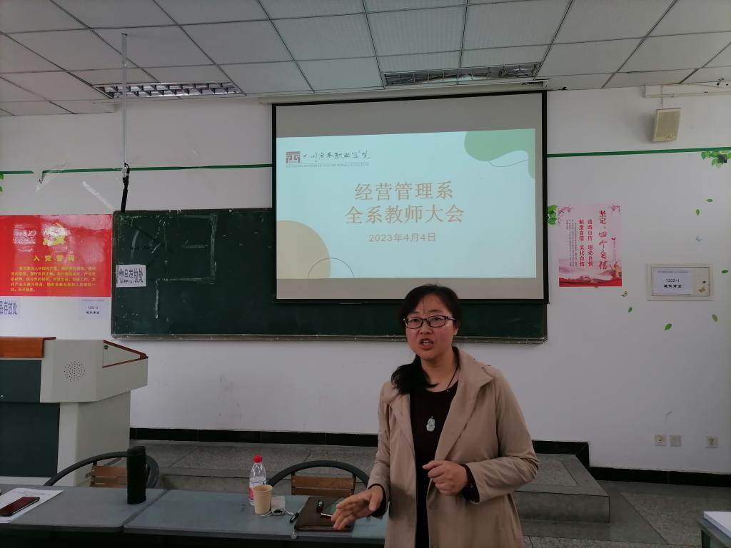 2023年4月4日下午1:30,经营管理系“党政联席会”、“教师大会”、“党员大会”在第一教学楼202室如期举行。出席本次会议的有经营管理系主任王琦、经营管理系党总支书记杨洪和全系教师。会议由系主任王琦主持。 党政...