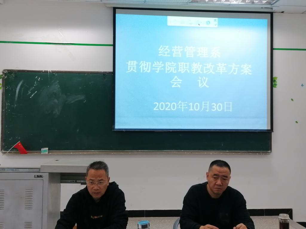 2020年10月30日上午9:30分,经营管理系召开学习《学院贯彻<四川省职业教育改革实施方案>工作方案》专题会,会议由系主任梁栋同志主持,全系行政人员、各专业负责人参加了会议。