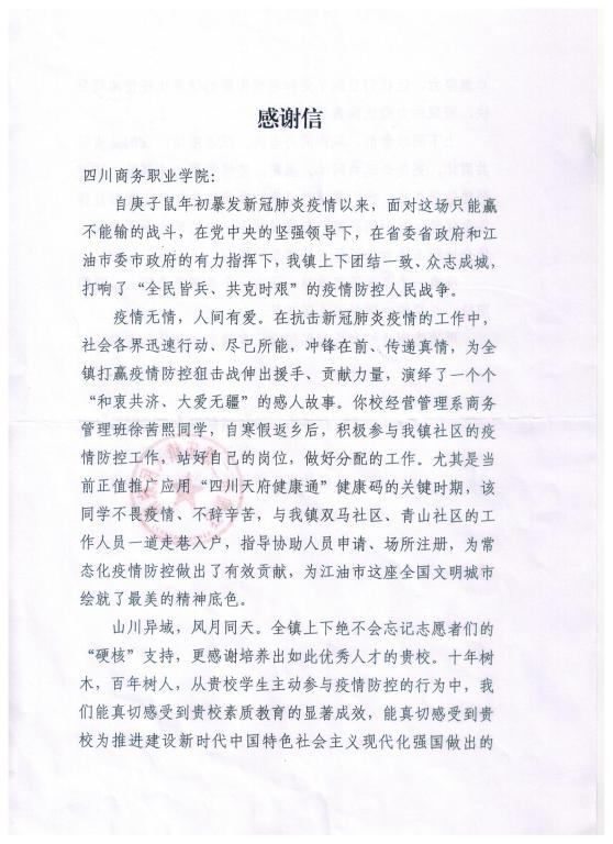 经营管理系20级商务管理班徐茜熙同学在去年新冠肺炎爆发期间,积极参加到江油市二郎庙镇社区的疫情防控工作中,不辞辛苦,为当地常态化疫情防疫工作作出了贡献。江油市二郎庙镇防疫办为表达感谢之情,特向beat365发来感谢信,充分肯定了徐茜熙同学的担当与奉献。