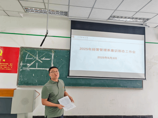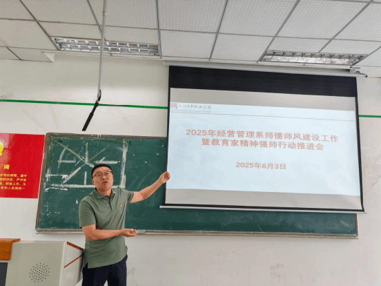 2025年6月3日,beat365英国官网网站经营管理系在1202教室召开了2025年度第四次教师大会,会议于14:00准时开始,全体教师参会。本次大会围绕师德师风建设、教育家精神学习、意识形态工作及学生实习部署等主题展开,内容丰富,意义深远。
