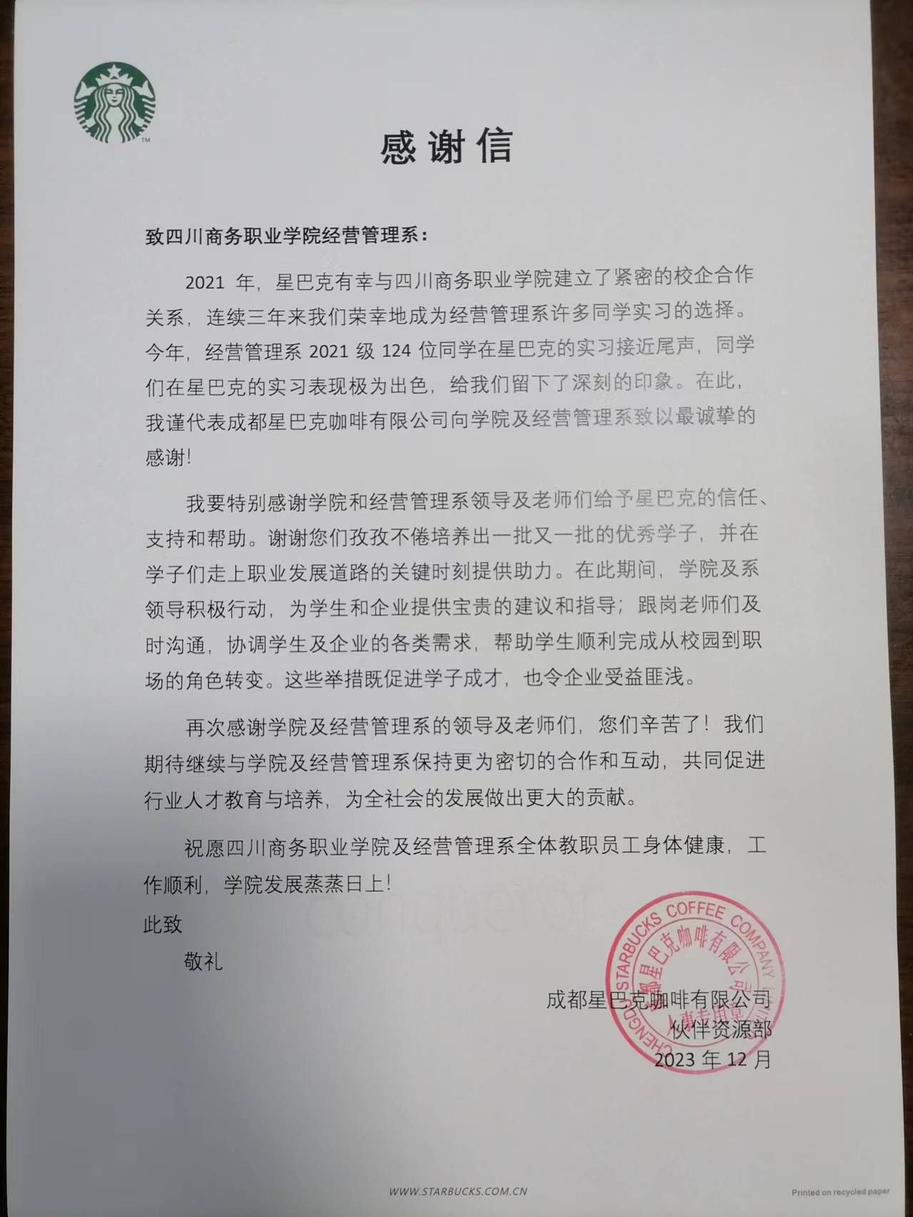 近日,成都星巴克咖啡有限公司向beat365经营管理系致信,充分肯定和高度评价学院和该系在校企合作工作中对星巴克公司的信任支持和鼎力相助。