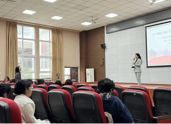 讲座以“蚁群搬石”案例开篇,生动阐释了团队协作在现代职业环境中的关键作用。杨兴群总裁系统解析了“π型人才”培养模式,强调以中医药专业知识为根基,以电商运营、直播技能等跨界能力为拓展,构建“双专长+深跨界”的复合型竞争力。她结合华鼎集团全产业链实践,详细介绍了包括药店店长、直播主播在内的十大岗位发展路径,并指出“实操能力权重达60%”,建议同学们分阶段夯实专业基础、积极提升实战技能。