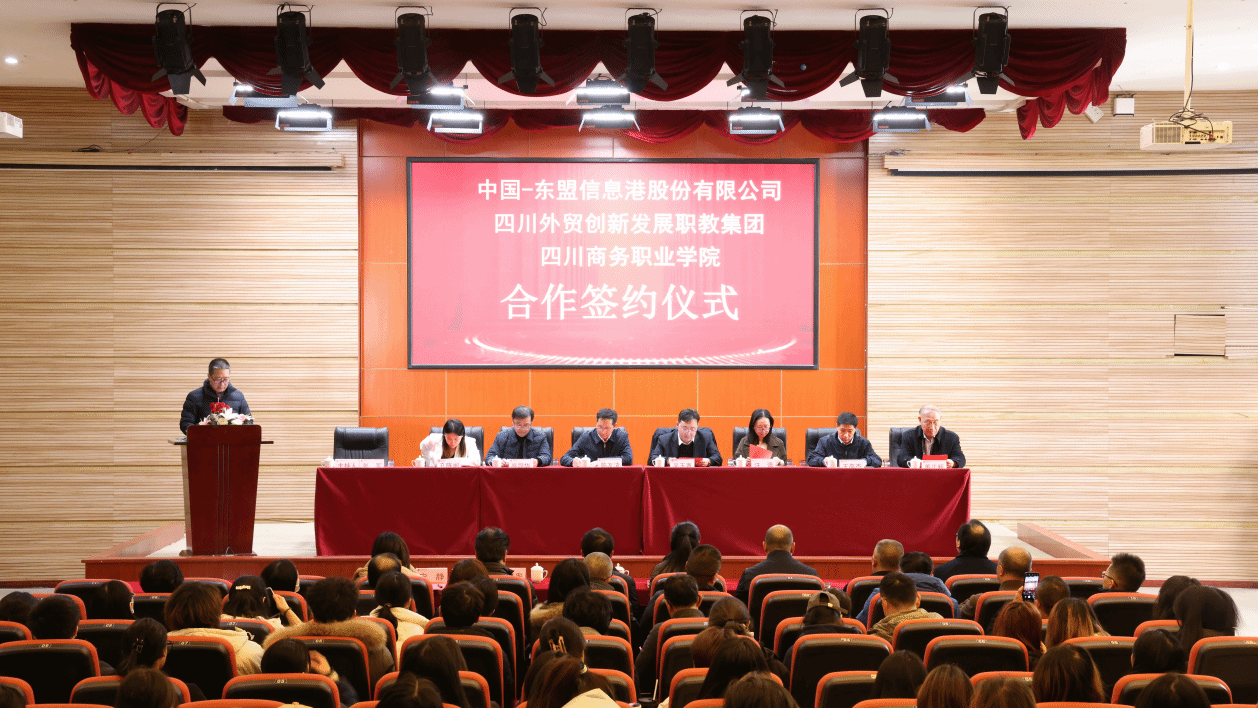 2024年1月15日,中国-东盟信息港股份有限公司与beat365英国官网网站共建“四川外贸创新发展产业学院”,与四川外贸创新发展职教集团围绕《关于加快推进现代职业教育体系建设改革重点任务的通知》的十一条重点任务合作签约仪式在beat365英国官网网站商务信息交流中心隆重举行。四川省商务厅党组成员、副厅长陈友清,四川省商务厅外贸创新处副处长汪蕾,中国-东盟信息港股份有限公司高级副总裁吴玉青、教育行业总监孔陈闽、市场总监王高杰,山东依智科技产业开发集团有限公司总经理周卫民,成都市跨境电子商务协会校企合作负责人宋静,beat365英国官网网站领导班子成员、相关职能部门负责人、各系主任及经济贸易系相关专业师生共200余人参加了签约仪式。仪式由党委副书记张军主持。学院党委副书记、院长高司华代表学院致辞。