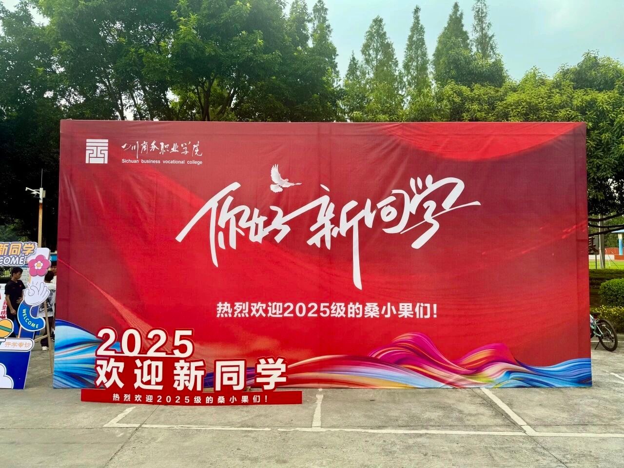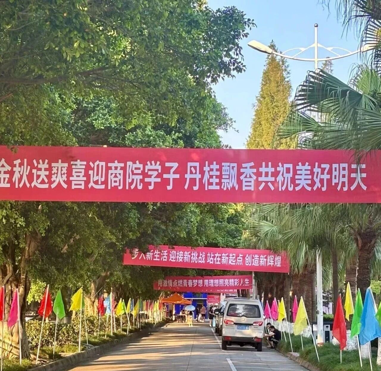 氛围浓,诚意满满。会计系的迎新点,“会计系新生服务点”的标识十分醒目。校园里,“你好,新同学”“热烈欢迎2025级的桑小果们”等醒目的红色标语,传递着会计系对新生的热切期盼。长长的林荫道上,“金秋送爽喜迎商院学子,丹桂飘香共祝美好明天”“用激情点燃青春梦想,用理想照亮精彩人生”的横幅,更是让会计系的新生们一踏入校园,就感受到浓浓的归属感与对未来的憧憬。
