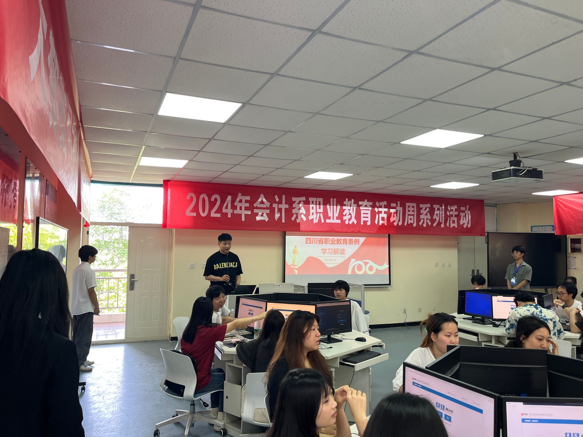 为贯彻落实《中华人民共和国职业教育法》和《四川省职业教育条例》,推进系部职业教育高质量发展,大力宣传劳模精神、劳动精神、工匠精神,弘扬劳动光荣、技能宝贵、创造伟大的时代风尚,进一步营造我系职业教育持续发展的良好氛围,会计系于5月14日下午14:30在金融实训室2302举行了职业教育活动周系列活动启动仪式及首场活动开赛仪式。本次活动旨在展示职业教育在教学领域取得的成果,并推动会计系职业教育的发展。参加今天启动仪式的有系部领导、各专业负责人、各项目负责人、全体辅导员老师以及部分专任教师代表。