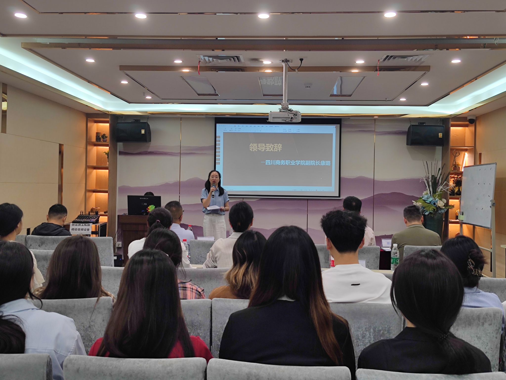 周家蓉首先对校方的合作支持表示了肯定,强调了职业教育与企业需求深度融合的重要性。同时,也对订单班的学员提出了明确的要求,期望他们能够转变思维模式,向以职业为导向的自主成长模式迈进,在未来的职业中,要继续巩固会计专业知识,熟练掌握办公软件和数字化工具的应用。最后,周经理还详细介绍了订单班的实训计划。