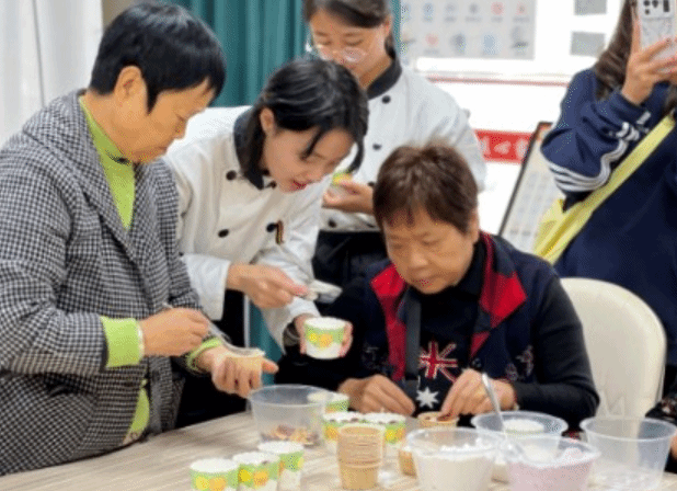 易树敏亲自示范,手把手教老人们制作重阳糕,同时为他们讲解了营养相关知识,解答了老人们的疑问。志愿者们也积极参与,辅助老人们一起动手制作重阳糕。在制作过程中,老人们不仅学到了营养知识,还体验到了动手制作的乐趣。