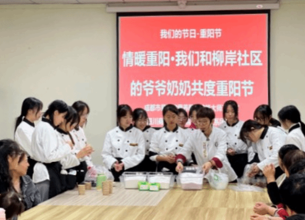这次活动得到了柳岸社区的大力支持,社区居委会主任汤仕兵、副主任朱婷、老年协会会长郭海燕、居委委员郭吉睿、旅游管理系党总支书记陈根元、成都市易树敏营养配餐技能大师工作室领办人及营养配餐专业负责人易树敏等参加活动。易树敏为老人们送上了一堂营养与健康知识课,并现场教老人们制作重阳糕。