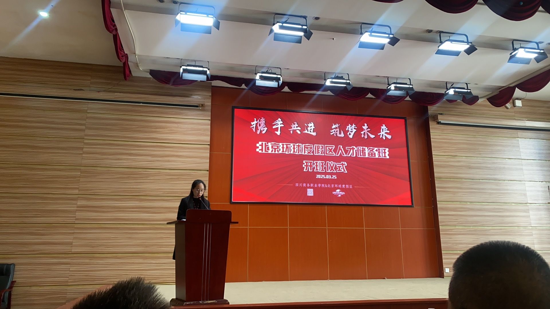 2025年3月25日上午,beat365英国官网网站与北京环球度假区校企合作人才储备班开班仪式在学院商务信息中心顺利举行。北京环球度假区人才招聘总监付颖,人才招聘经理任小超,校园招聘顾问董佳昕,学院副院长康璐领导,党委委员、副院长王军出席活动,教务处副处长刘磊主持开班仪式。