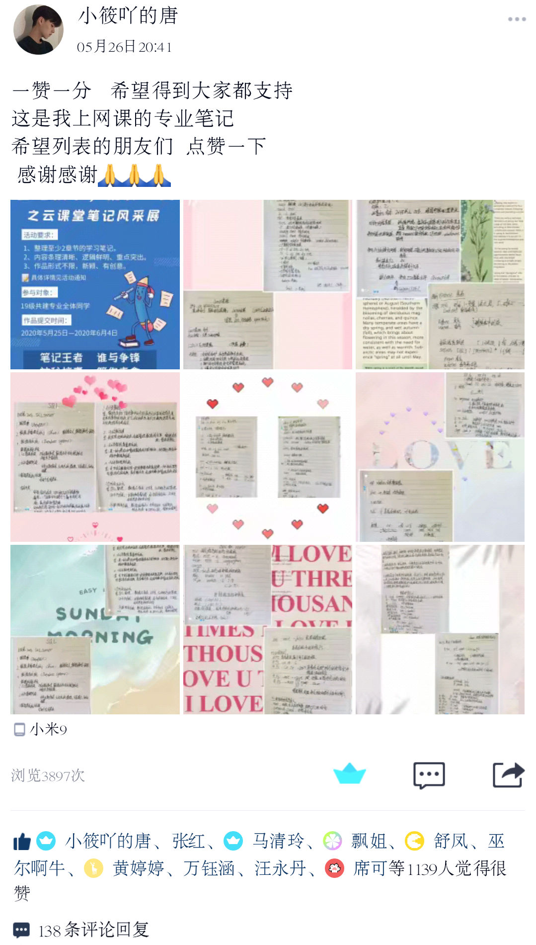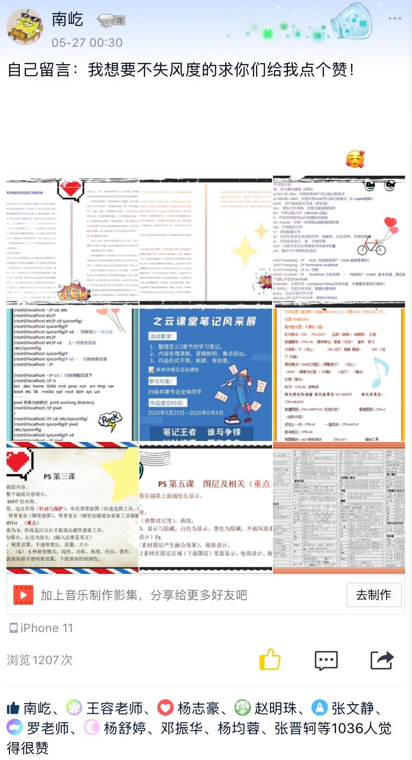 本次活动以班级为单位,通过新颖的游戏规则,鼓励同学们在各大社交平台展出自己优秀的笔记作品。在活动期间,我们在QQ空间、微信朋友圈、抖音等社交平台随处可见,有短视频、相册组、Vlog……争奇斗艳!
