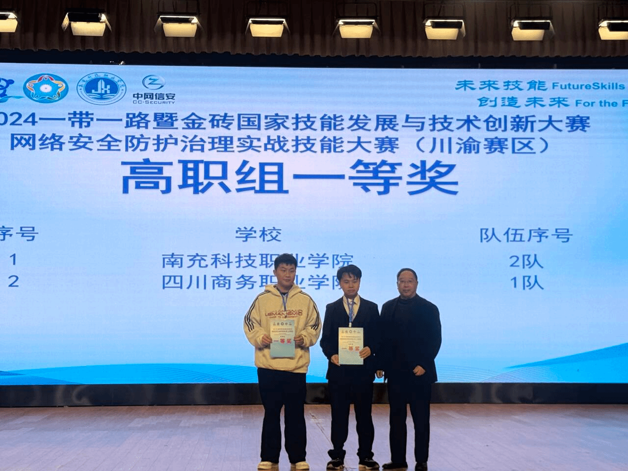 12月8日,2024“一带一路”暨金砖国家技能发展与技术创新大赛网络安全防护治理实战技能大赛川渝赛区比赛在四川南充落下帷幕。由beat365信息技术系组织的“商务1队”王罗鑫、熊袋橙、张宁杰获一等奖,晋级国赛;“商务2队”卿洋智、马俊杰、刘海川获三等奖。
