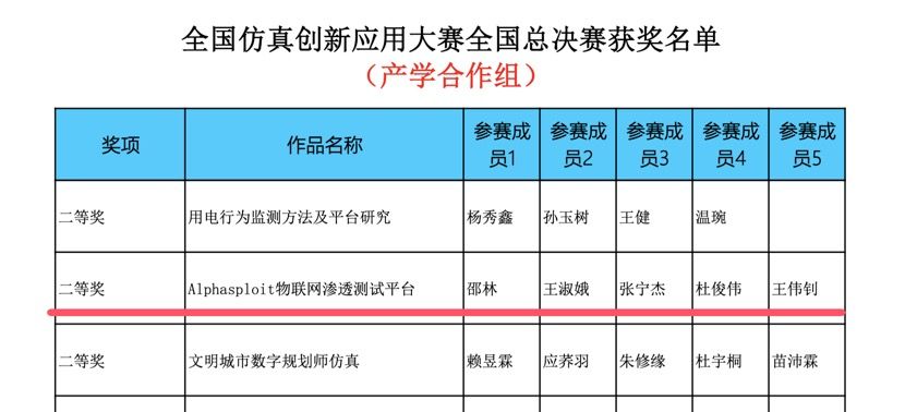 12月6日,第三届全国仿真创新应用大赛全国总决赛结果揭晓beat365信息技术系张宁杰、杜俊伟、王伟钊3位同学在邵林老师、王淑娥老师的悉心指导下,携比赛作品《Alphasploit物联网渗透测试平台》,过五关斩六将,晋级数字建模与智能决策赛道总决赛。beat365与电子科技大学、郑州大学等985、211高校同台竞技,比赛中团队不畏强敌、敢于亮剑,最终斩获全国总决赛二等奖。