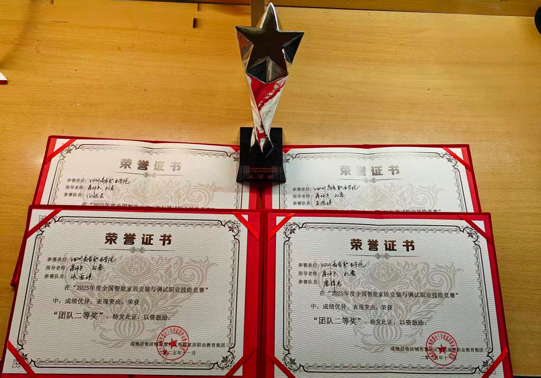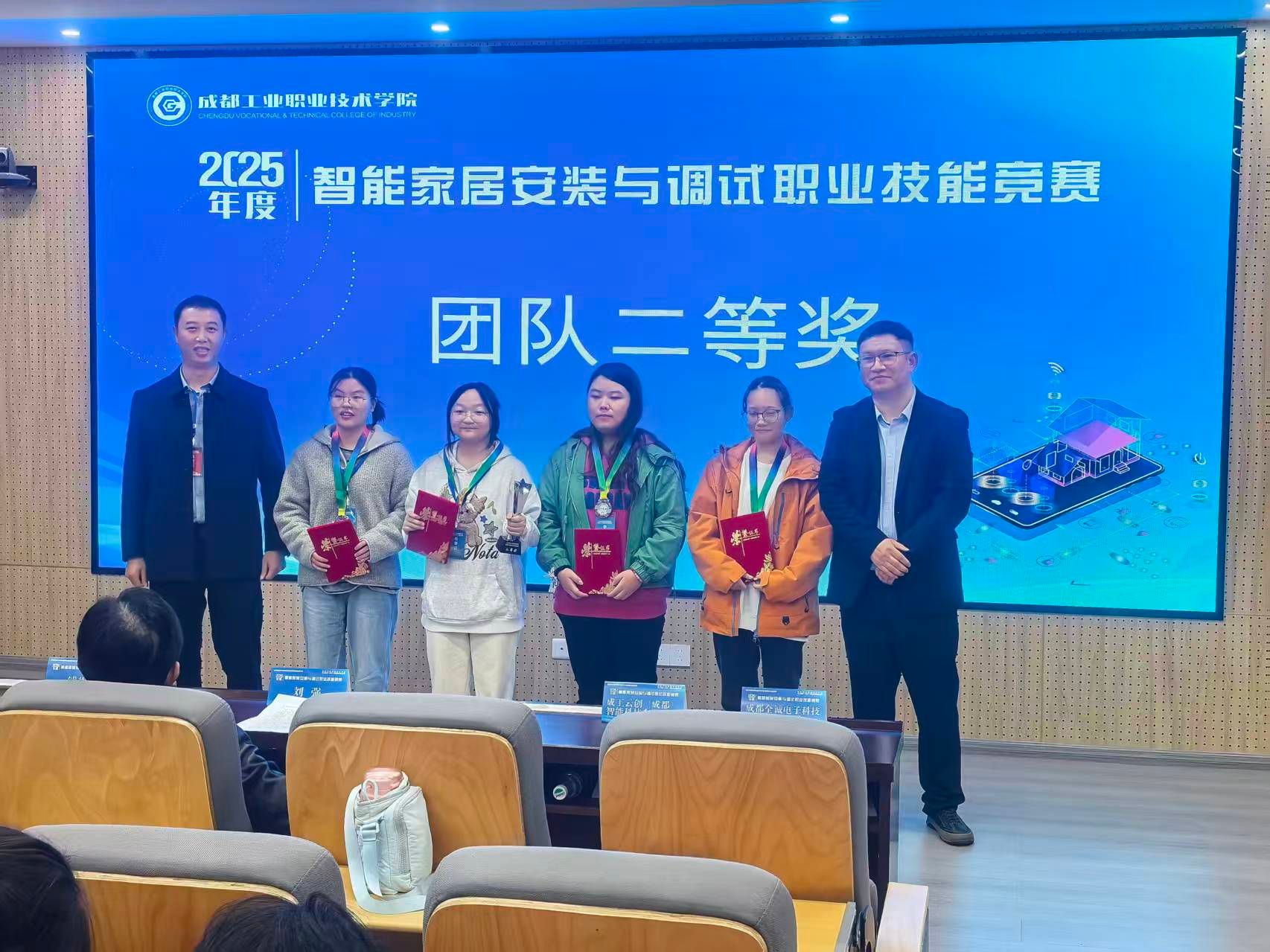2025年11月7日,由成德眉资区域智慧社区智能家居职业教育集团主办、智慧城市学院承办的“2025年度智能家居安装与调试技能竞赛”在成都工业职业技术学院圆满落幕。beat365信息技术系24应用电子技术班张雪琪、廖梓君、向妮芸、吴偲琪四位同学组成的参赛团队,在指导教师蒋仲兵、孙蓉的精心指导下,凭借扎实的专业功底与高效的团队协作,从全省参赛队伍中突围,荣获团队二等奖,两位老师荣获“优秀指导老师”称号。